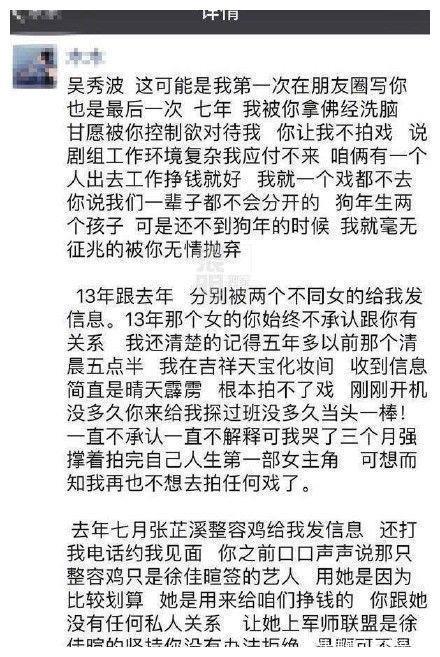 吴秀波成为顶流没多久,隐没已久的陈昱霖,在酬酢平台发布长文,驳诘吴秀波,在文中她承认和吴秀波保抓地下恋七年,还说我方被吴秀波的佛经洗脑,不让她去拍戏。 陈昱霖奢靡无度的生计皆是吴秀波提供的,吴秀波以致还给她在北京买了一处价值2000万的房产,这七年里,陈昱霖更是思去哪旅游胜利乘坐私东说念主飞机赶赴,说是被洗脑,还不如说是被资产所舒服。 濒临陈昱霖的驳诘,吴秀波一初始并未作念出任何回复,这让许多粉丝皆嗅觉这件事,即是一个巴掌拍不响,天然吴秀波是婚内出轨,但她知三当三,也没强到哪去。 陈昱霖看他对我方置之不睬,接二连三的在酬酢平台发。