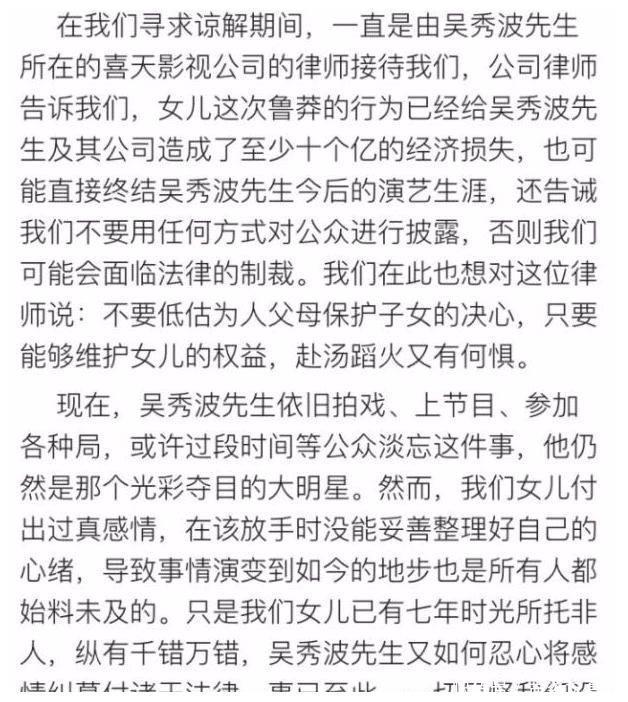 其中包括了,她在横店陪吴秀波拍摄《智囊定约》,整整333天,皆莫得出过酒店房间,每天为吴秀波作念饭洗衣,吴秀波去哪拍戏她就必须跟到哪,温存吴秀波的衣食起居。 整整七年,她皆莫得职责,莫得拍戏,心甘甘心当着吴秀波的私东说念主保姆。 吴秀波这种一步步在文娱圈站稳脚跟的东说念主,怎样可能会被这种事情所困扰,更何况这个被他“圈养”的陈昱霖。 让她曝光的原因,并不是十足因为吴秀波的圈养,是其他小四小五的寻衅,她们给陈昱霖发短信,说我方也跟吴秀波有着说不清的有计划,这一度让陈昱霖嗅觉我方的地位不保,况且吴秀波会为了其他东说念主摒弃她,要不她怎样会毁掉奢靡的生计不接续,而接管与吴秀波撕破脸皮。